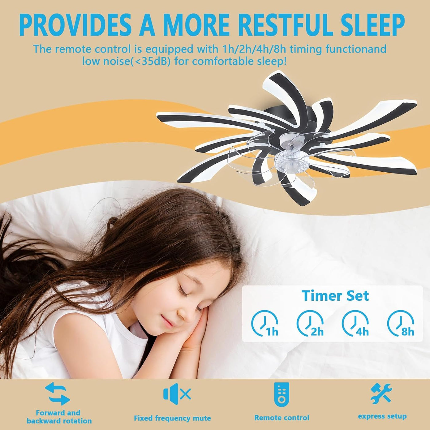 【High Quality & Low Noise】: Our ceiling fan with light and remote control features a lightweight design with a quality solid copper motor and acrylic cover. Each ceiling fan with light runs smoothly with strong airflow and no noise! In addition, When the timer function is activated, it can be set to turn off automatically after 1 / 2/4/8 hours. Meet your customization needs for a more relaxing break!
