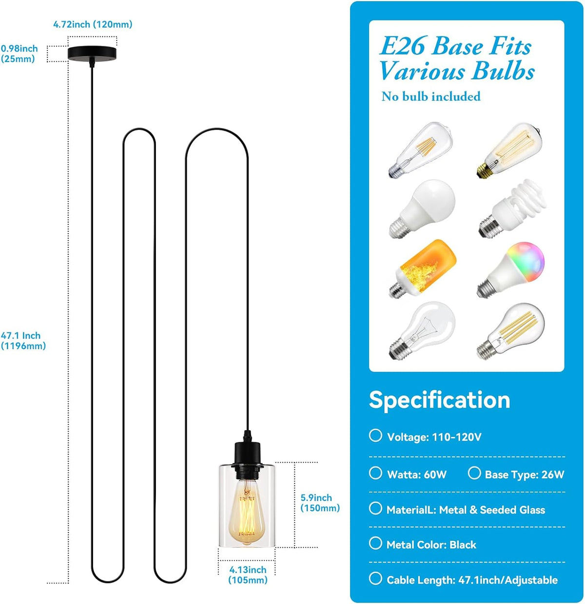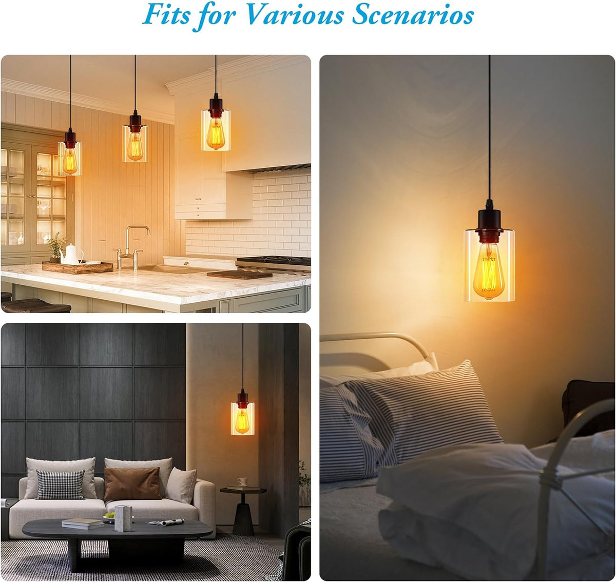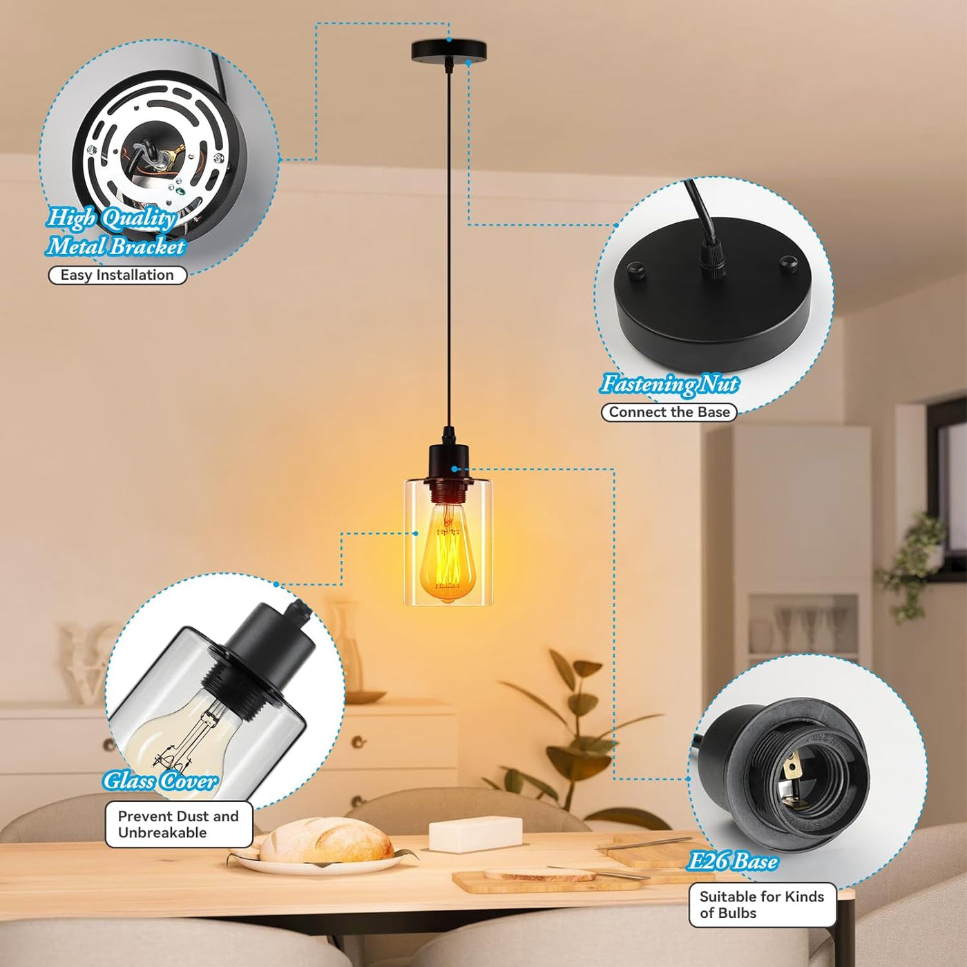 Living RoomEvitalize your living room with the sleek sophistication of our single pendant light. Its versatile design seamlessly complements any décor, casting a welcoming glow that invites relaxation and conversation. Ideal for creating a focal point or cozy reading nook, this single pendant light is the essence of stylish functionality | BedroomEnhance the tranquility of your bedroom with our single pendant light. Its gentle illumination provides a serene backdrop for rest and relaxation. Perfect for hanging over nightstands or creating a peaceful corner, this single pendant light offers a blend of comfort and contemporary style, essential for any modern bedroom. | Dining RoomElevate your dining experience with our elegantly designed single pendant light. Its radiant yet unobtrusive light sets the tone for memorable gatherings, complementing every meal with its warm ambiance. This single pendant light, ideal for dining areas, combines functionality with aesthetic appeal, making every dinner an event to look forward to |