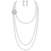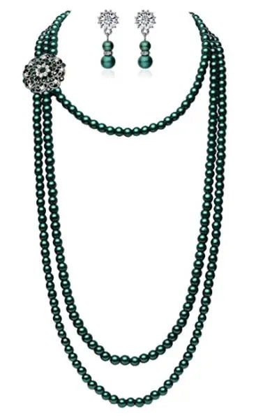 Vintage multi-layer long pearl necklace with crystal flower brooch (not removable from the necklace), a great flapper dress accessory jewelry, also can be used as a sweater chain.