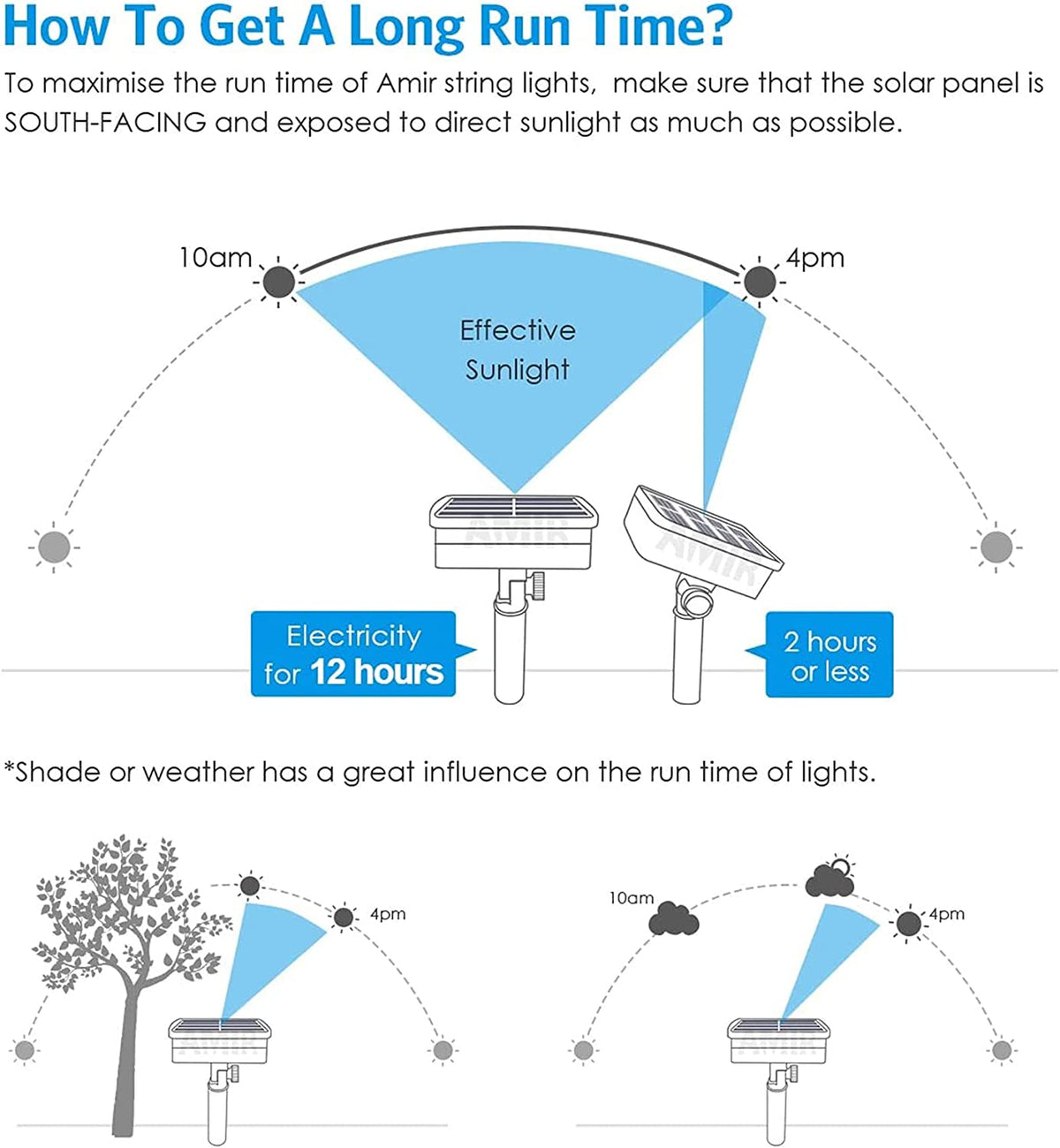 This Solar Panel of the String Light will be charged under sunshine,after the Solar Power charge,it will light up your Garden at night automatically.
