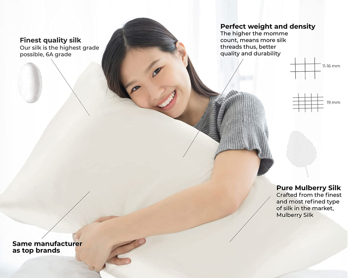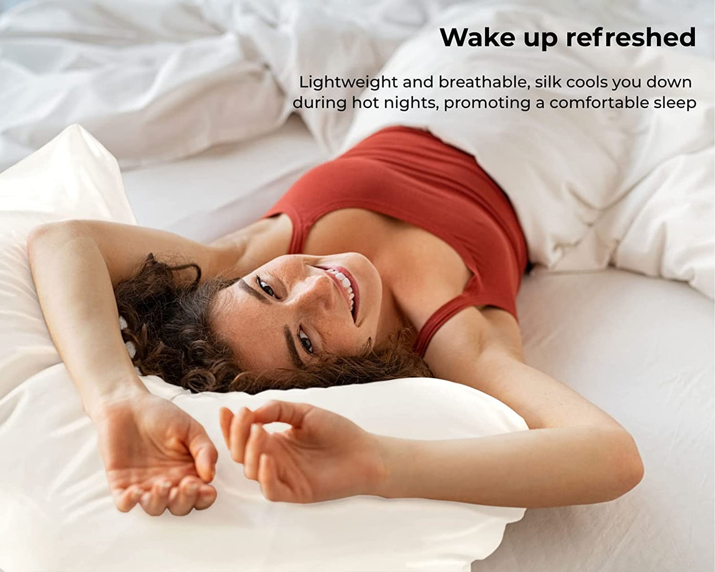 【Hydrated Skin & Temperature Regulating】Silk contains 18 amino acids that help retain your skin’s moisture leaving your skin glowing in the mornings. It also keeps you warm in winter and cooler in summer. No more tossing and turning your pillows!