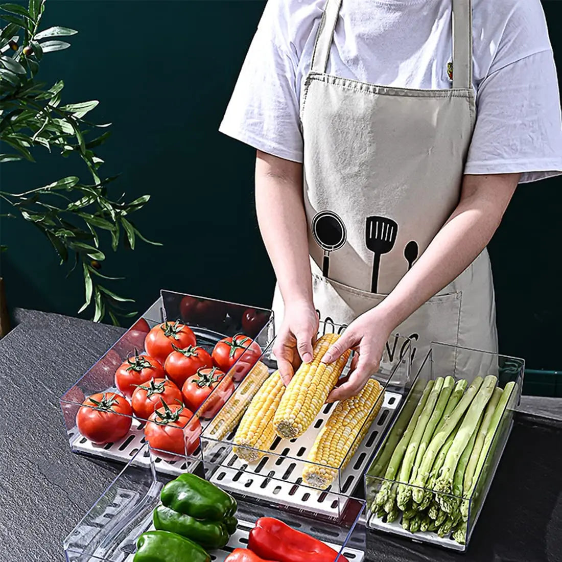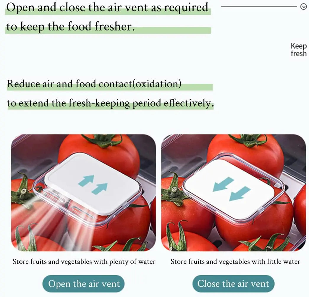 【Drain and Breathable】 The refrigerator storage box has a drain partition, fruits and vegetables can be drained through the bottom. There are ventilation holes on the top, which can be opened or closed according to use, reducing air contact with food, effectively extending the freshness period