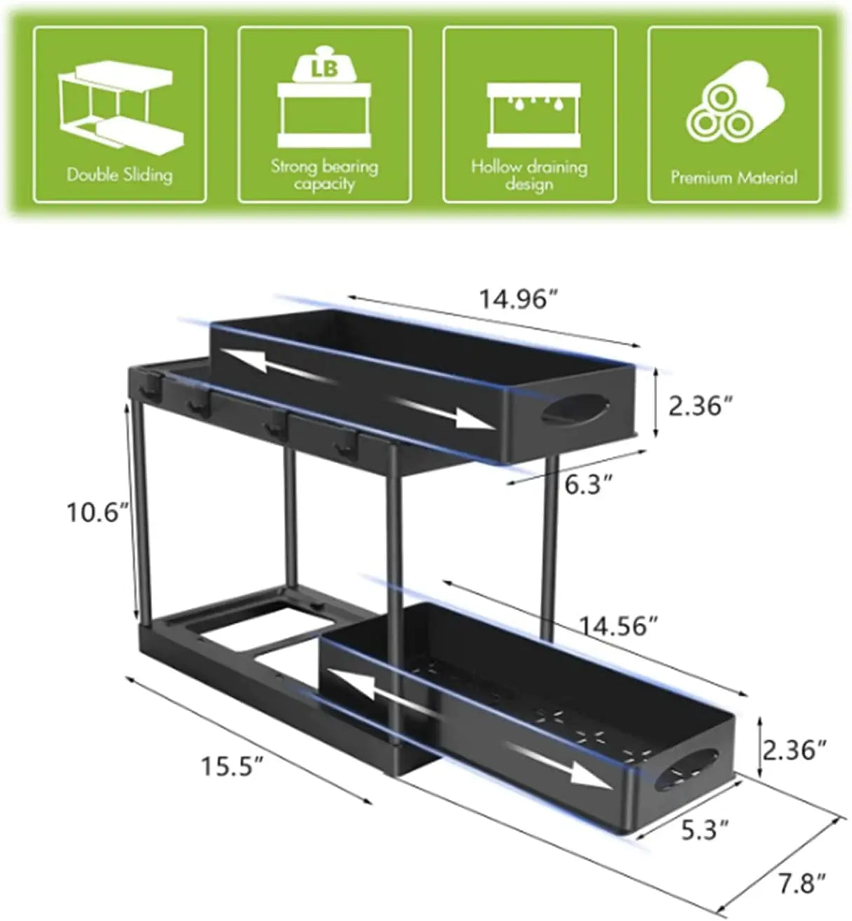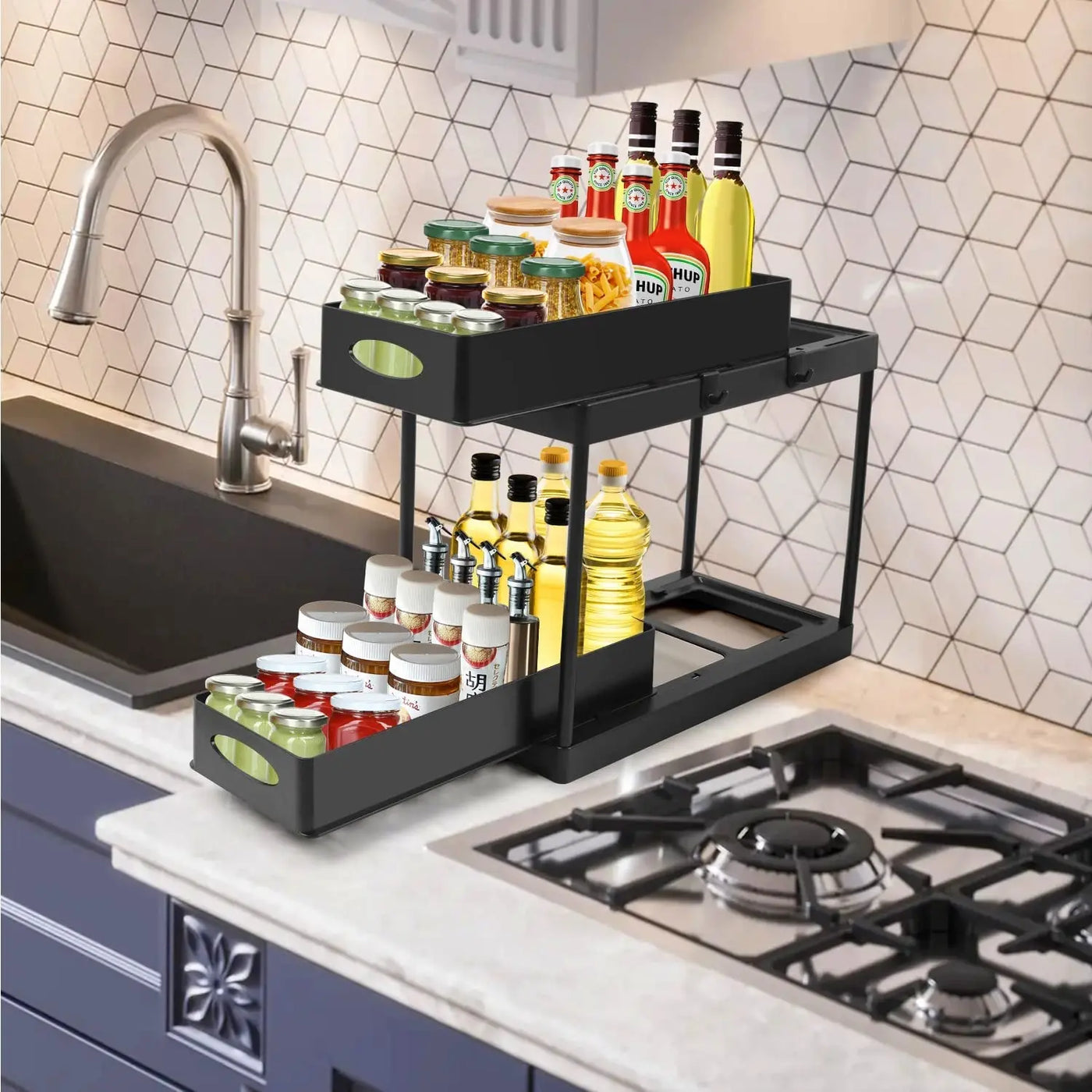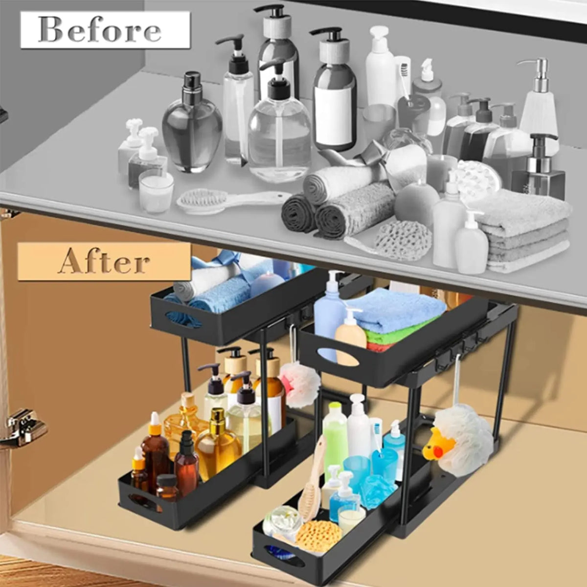You will need this 2-tier under sink organizer. The 2 tier maximizes vertical space and provides a versatile organization solution for your kitchen cabinets, pantry, or as a cosmetic storage rack or kitchen spice rack.