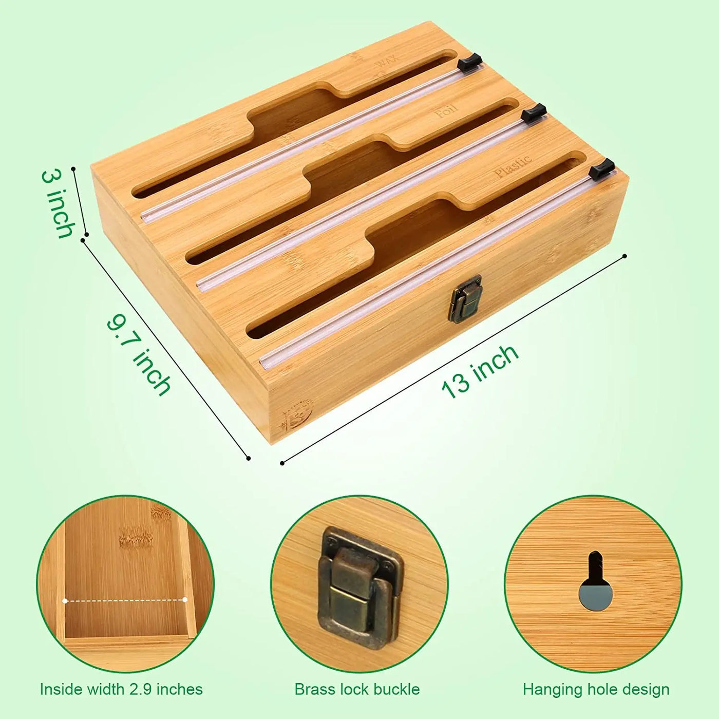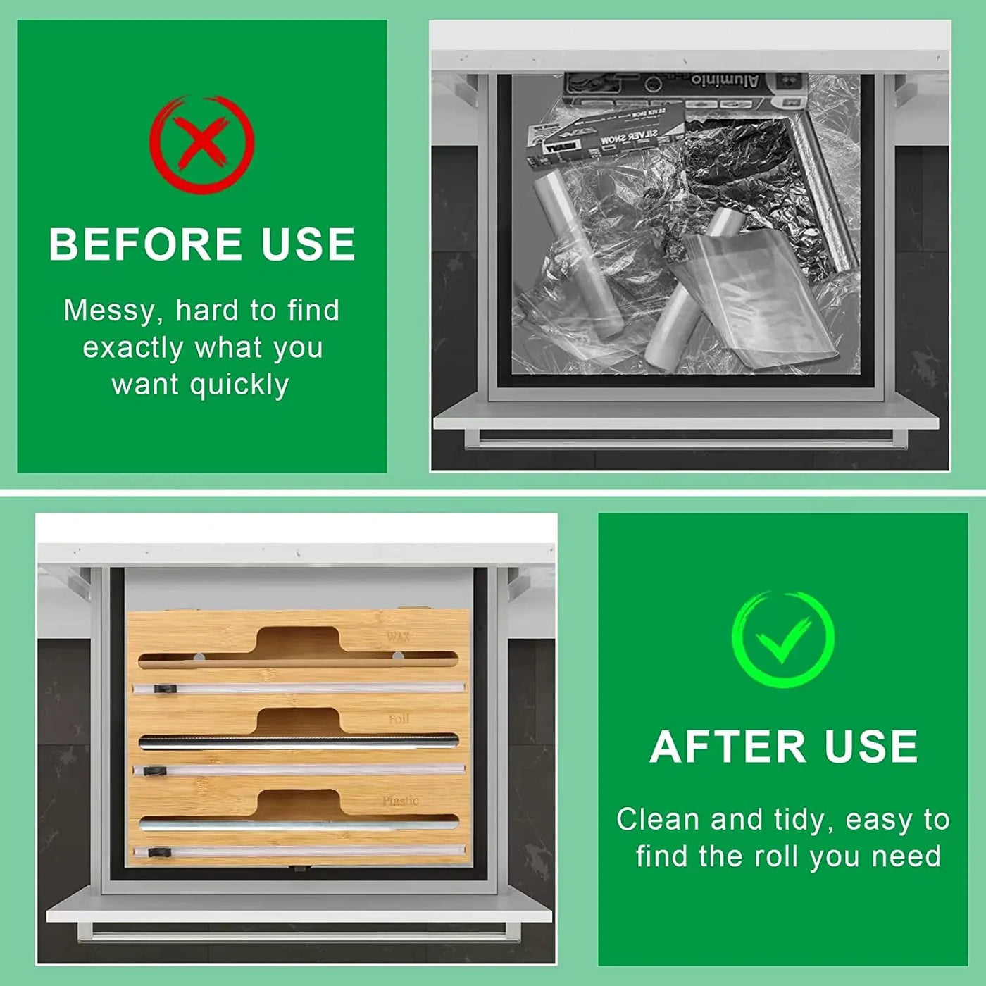 【Embrace Neatness】Are you still troubled by all kinds of food packing boxes crowded in the drawer in kitchen? Get the bamboo food wrap dispenser with cutter will save drawer space and keep tidy.