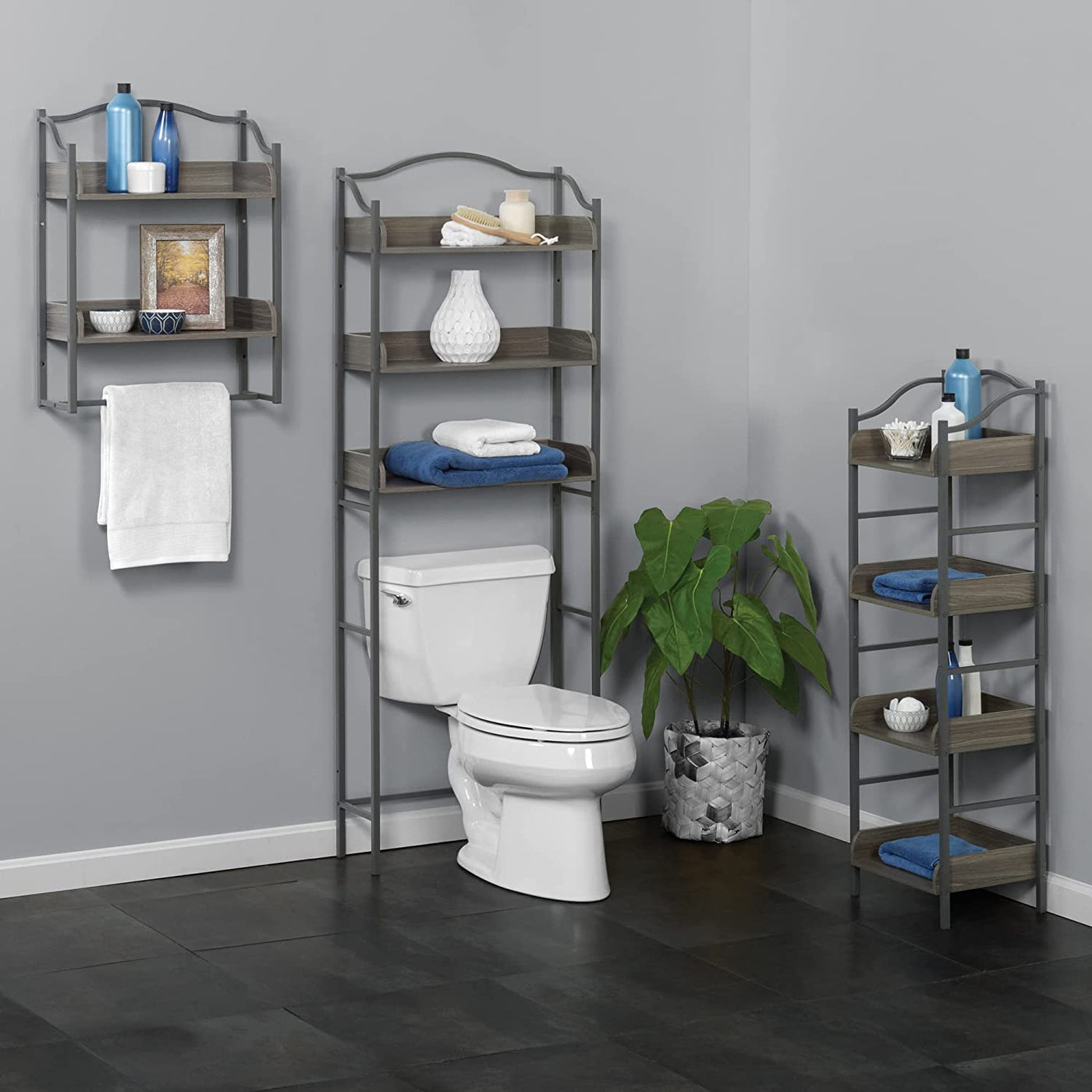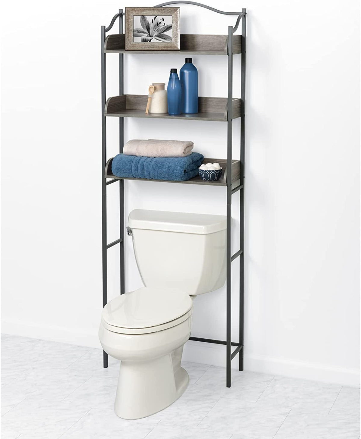 Instantly create more storage space inside your bathroom with the Zenna Home Over-the-Toilet Spacesaver. Using the normally wasted area above the toilet, this durable space-saving unit adds three levels of valuable storage into any bathroom. The bathroom spacesaver's sleek, pewter-finished metal frame is matched with driftwood gray shelves to create an attractive and highly functional bathroom storage piece. Its solid wood shelves can store assorted toiletries, washcloths, linens or decorative bathroom accessories. The bottom shelf sits 35 inches above the ground, providing plenty of clearance space for a standard-sized toilet.