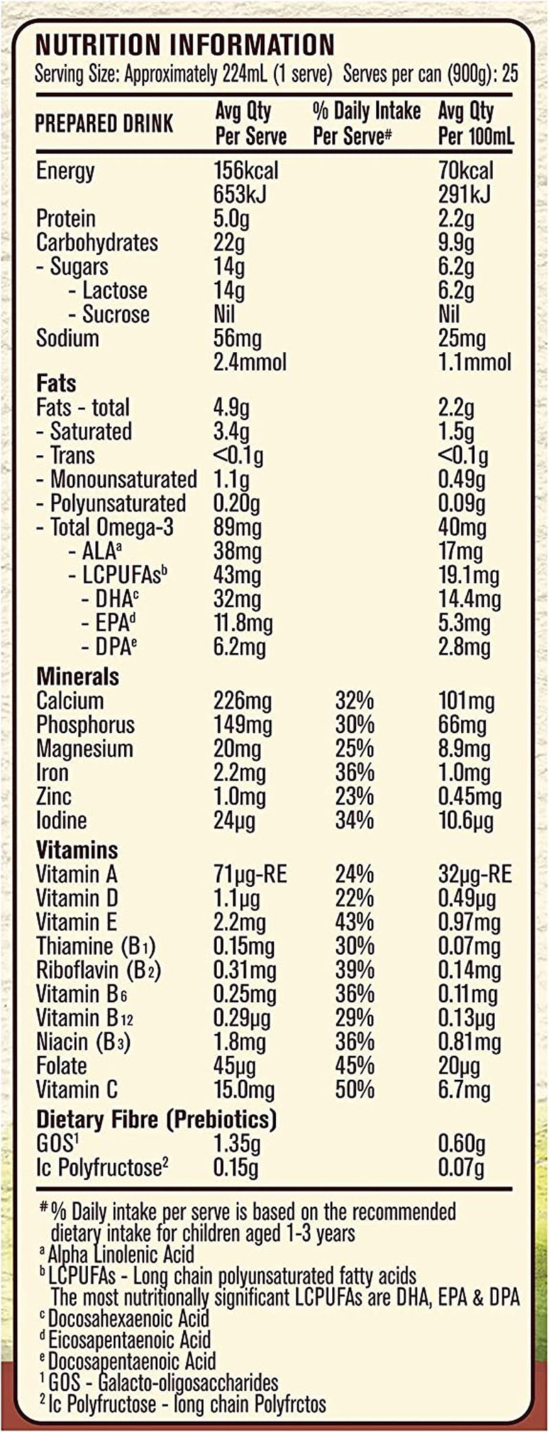 16 Vitamins and minerals for growth and development; Contains 16 vitamins and minerals including iron, zinc and calcium to support normal growth and development in young children when prepared as directed and consumed as part of a healthy varied diet