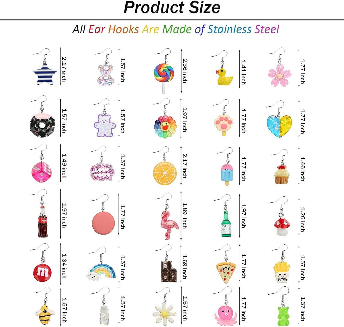 30 Pairs Weird Fun Cute Earrings for Women Kawaii Earrings Including Flamingo Rainbow Duck Gummy Bear Water Bottle Pizza Fries Mushroom Conch Drop Dangle Earring Set for Girls - 1-30Pcs