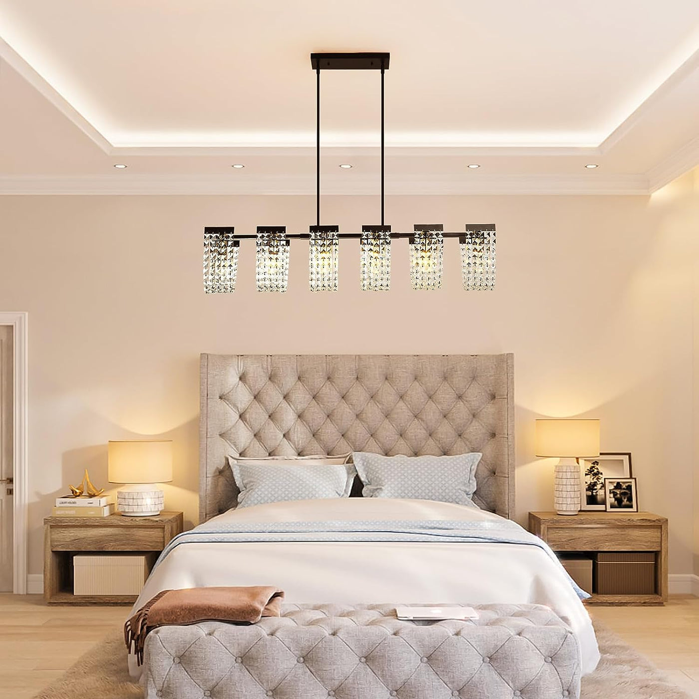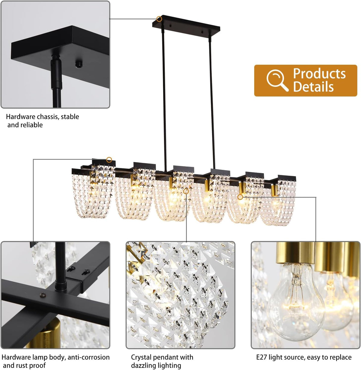 6-Light Kitchen Island Lighting Farmhouse Black Dining Room Chandelier Vintage Adjustable Linear Pendant Light Fixture with Metal&Crystal Finish (48" Length, E27 Bulbs)