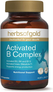 Herbs of Gold Activated B Complex contains activated B vitamins, including B2, B6, methylfolate (folate) and mecobalamin (B12), to help support energy production and assist in the maintenance of general wellbeing. B vitamins support the health and production of red blood cells and supports cardiovascular system health. Activated B Complex contains mecobalamin (co-methylcobalamin), the active form of vitamin B12. Other forms of vitamin B12, such as cyanocobalamin, need to be converted to co-methylcobalamin for use in the body. Methylfolate and vitamin B12 support memory and cognitive function. Methylfolate also helps reduce homocysteine levels.