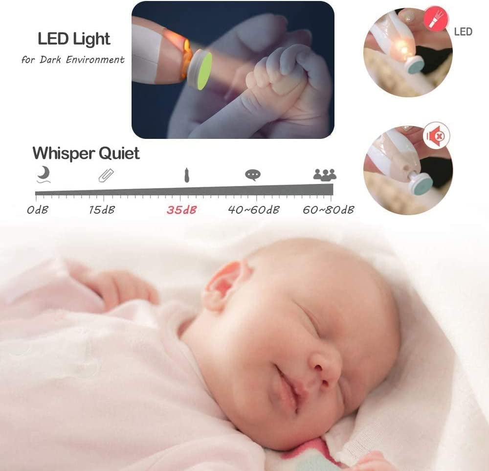 · [ Whisper Quiet and LED Light ] - The electric baby nail file is equipped with a whisper quiet motor so you can trim your sleeping baby’s nails without waking them up. The nail care kit has been created with a LED light at the front that turns on when the trimmer is activated, allowing you to safely file nails in the dark as well.