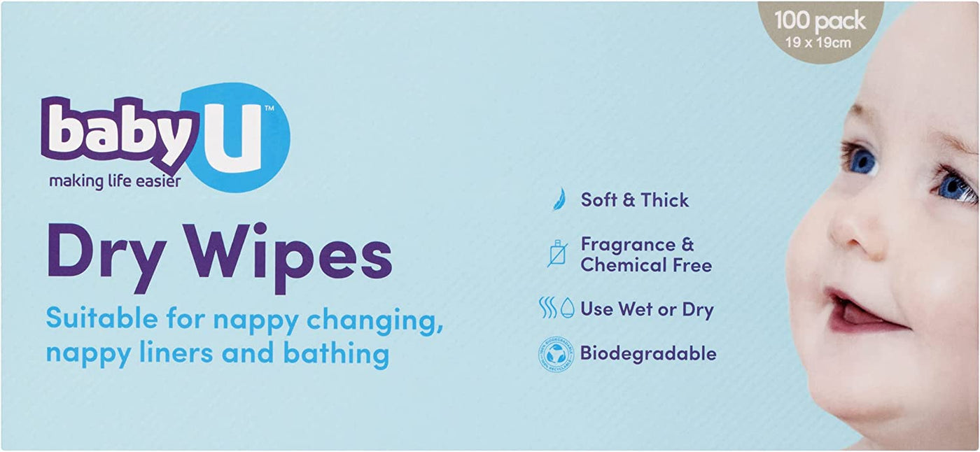BabyU Dry Wipes are suitable for nappy changing, nappy liners and bathing. 100% Biodegradable soft and thick wipes, Fragrance and Chemical free. Use wet or dry