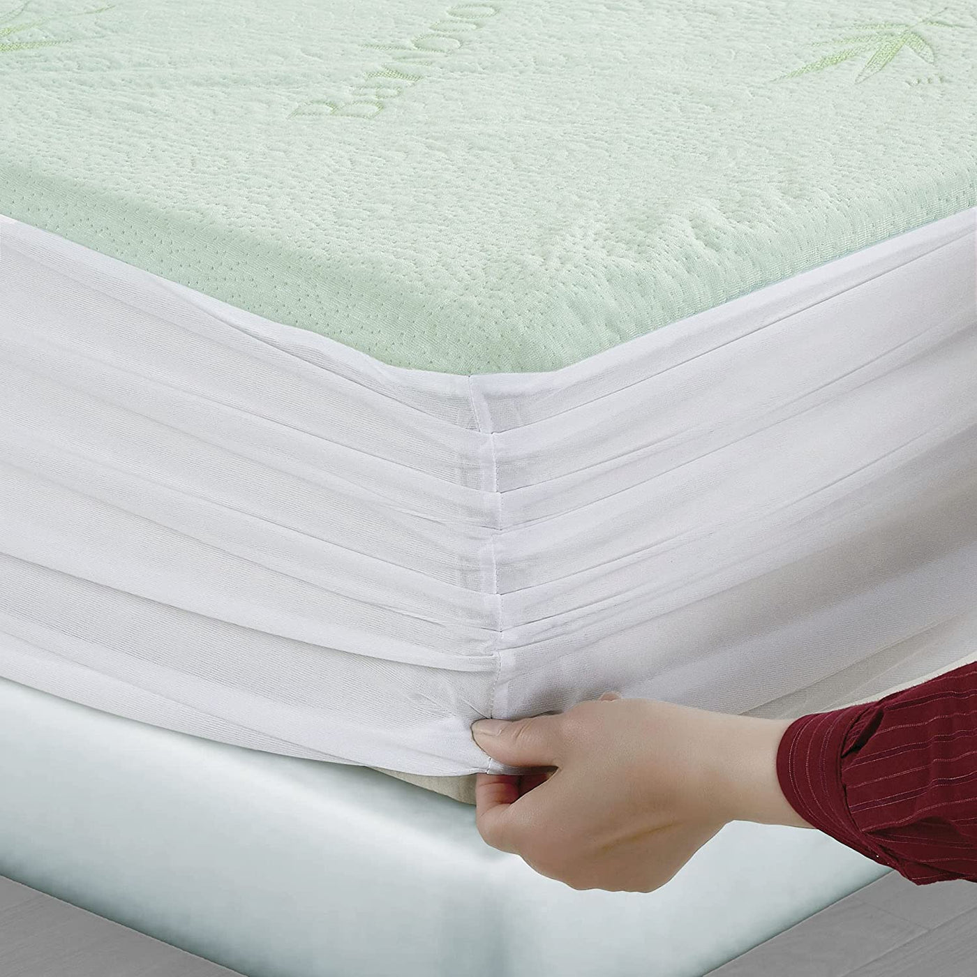 Luxton Breathable Bamboo Waterproof Mattress Protector is made of multiple layers of materials. 40/60 soft bamboo viscose and premium microfibre blended fabric on the top of the mattress protector, which offer softness and natural air breathable through feel to human body while sleeping on it. Specicially layered TPU is designed for water proofing. Fully fitted bed skirt with 40cm wall support the stretch up to 50cm. Cold machine washable. Gentle cycle only. Do not bleach. Do not tumble dry. Do not dry clean. Do not iron.