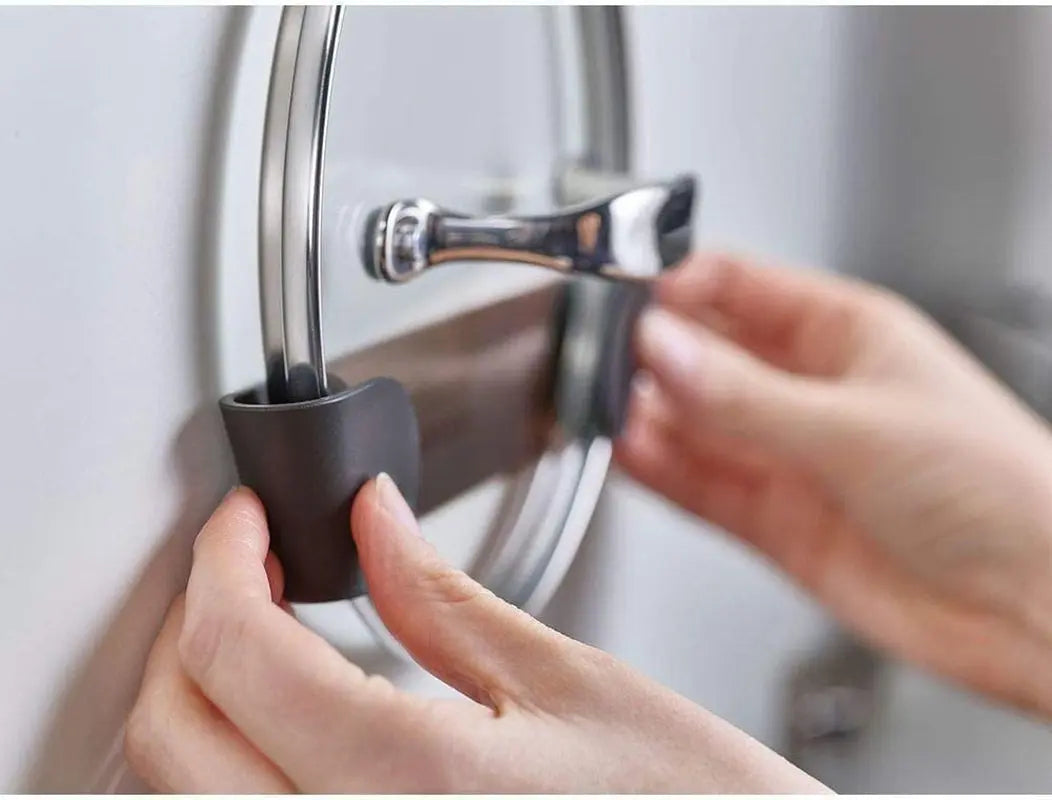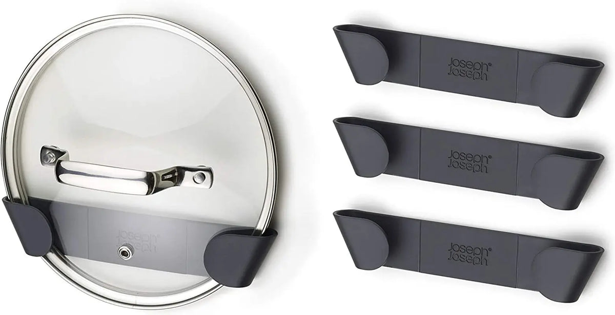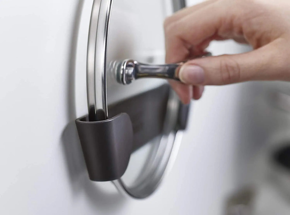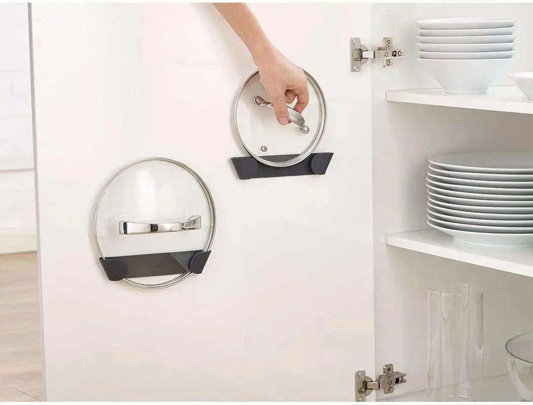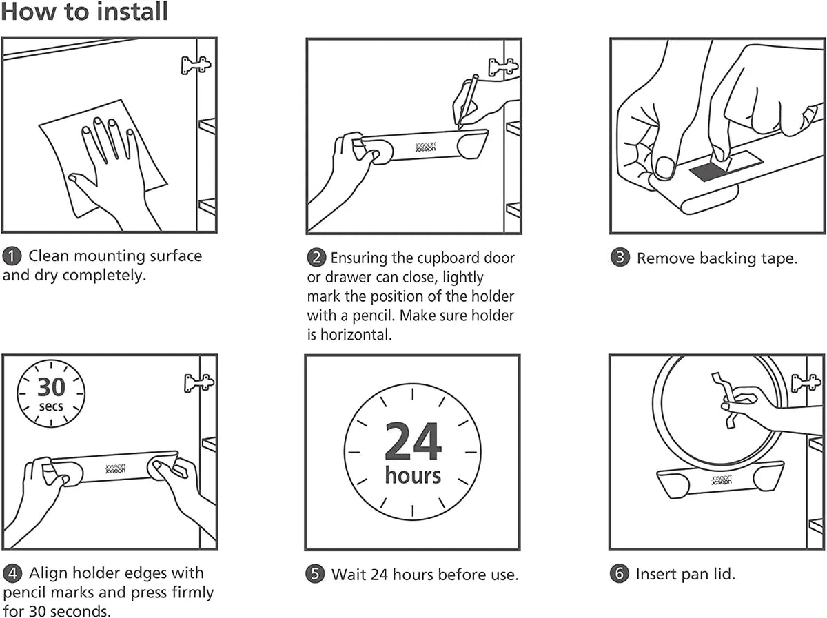 Pan lids can often be awkward items to store but not any more with this simple solution. Supplied as a set of four, each individual holder can be mounted onto the inside of a cupboard door or deep drawer and neatly holds one pan lid. Easy to install using strong 3M VHB tape, the holders are suitable for standard lids 16-24 cm (6¼-9½ inches) in diameter. How to install: 1. Clean mounting surface and dry completely 2. Ensuring the cupboard door or drawer can close, make sure holder is horizontal and lightly mark the position of the holder with a pencil 3. Remove backing tape 4. Align holder edges with pencil marks and press firmly for 30 seconds 5. Wait 24 hours before use