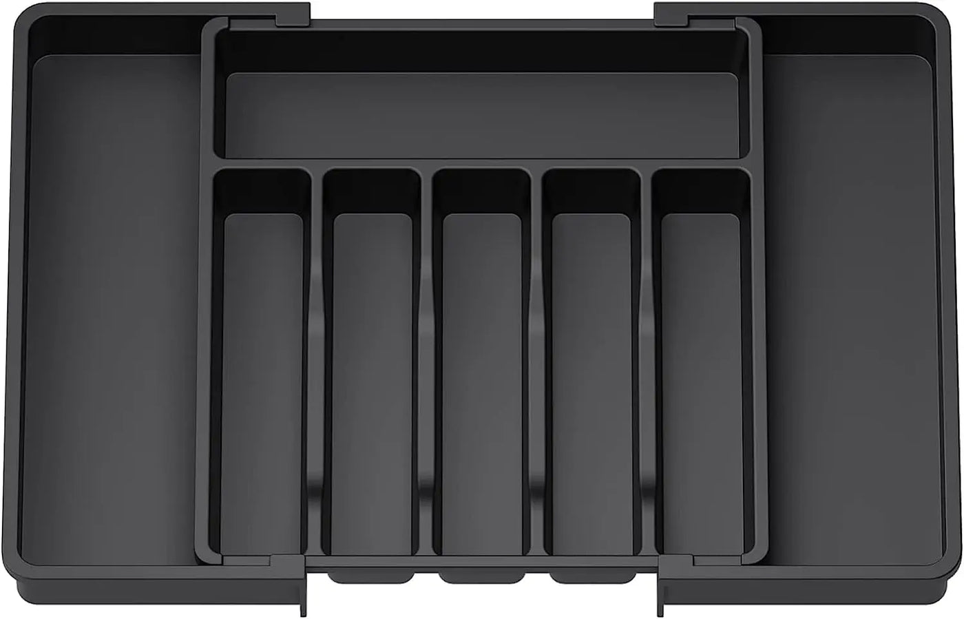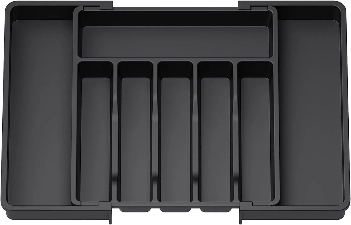Cutlery Drawer Organiser, Expandable Utensil Tray for Kitchen, Adjustable Silverware and Flatware Holder, Compact Plastic Storage for Spoons Forks Knives, Large, Black - Black