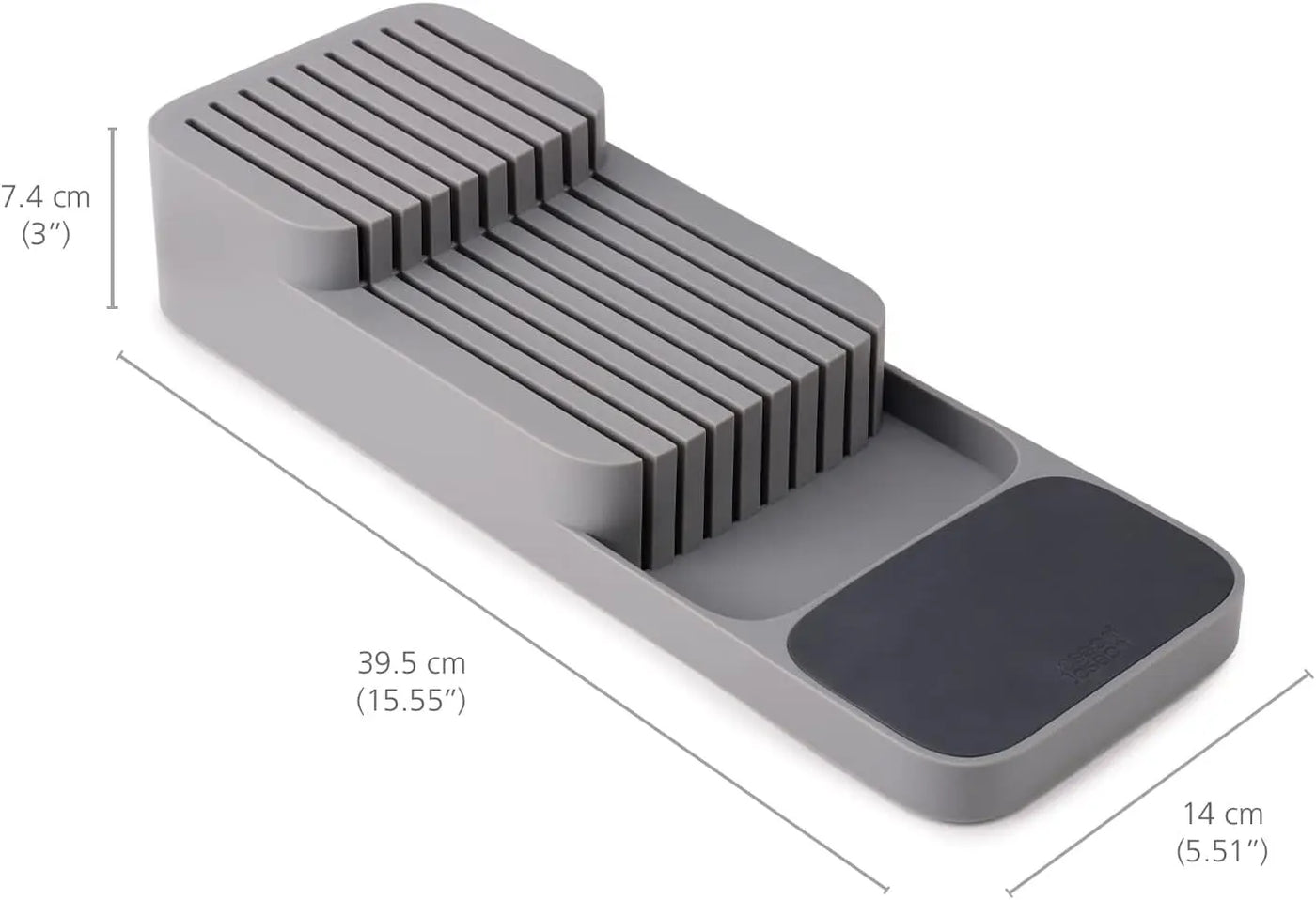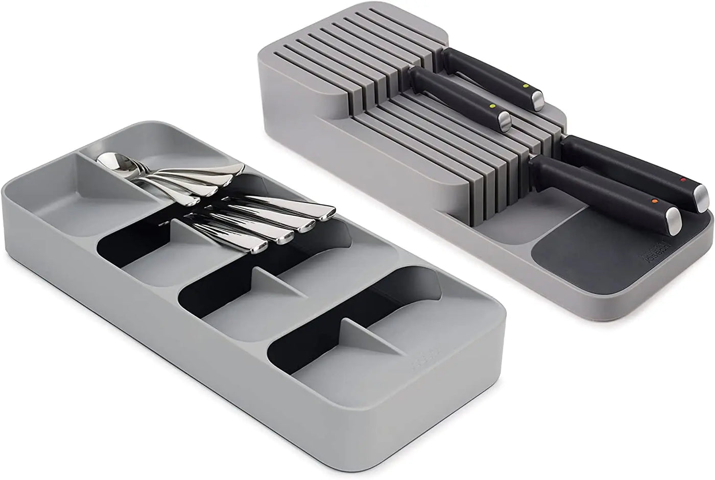 Get your kitchen drawers in order with this innovative 2-piece set. The cutlery tray features angled compartments that layer on top of each other, enabling over 48 pieces of cutlery to be stored in much less space. Items can be placed inside either head or handle first and the design features handy icons for easy identification and non-slip feet. The 2-tier knife organiser provides both safe storage and easy access for a range of kitchen knives. It features two levels for different blade lengths and can hold up to nine knives in a neat, compact space. Non-slip feet on the base stop the unit from sliding around in your drawer. Suitable for knife blades up to 9 inches (23 cm). Both items suitable for drawers with a minimum height of 8 cm (3¼ inches).