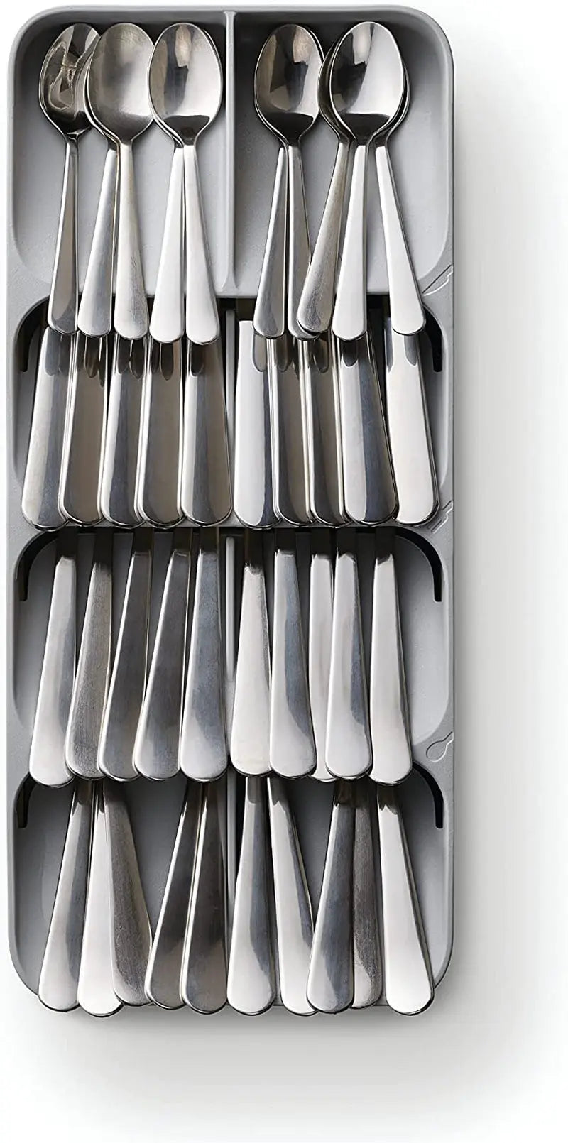 Cutlery organiser features space-saving, overlapping compartments with cutlery icons
