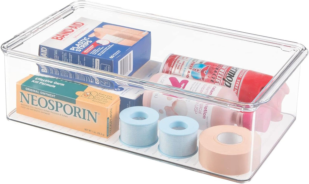 SMART STORAGE: Keep medicine cabinet clutter under control by organizing and storing items neatly and in their place in this compact container; Sized to fit vitamin bottles, medicine, aspirin, band aids, first-aid essentials, bandage dressings, diabetic supplies and more; These bins can be used in the refrigerator, making them perfect for medicines that need to be kept cold; Keep items contained, organized and dust free
