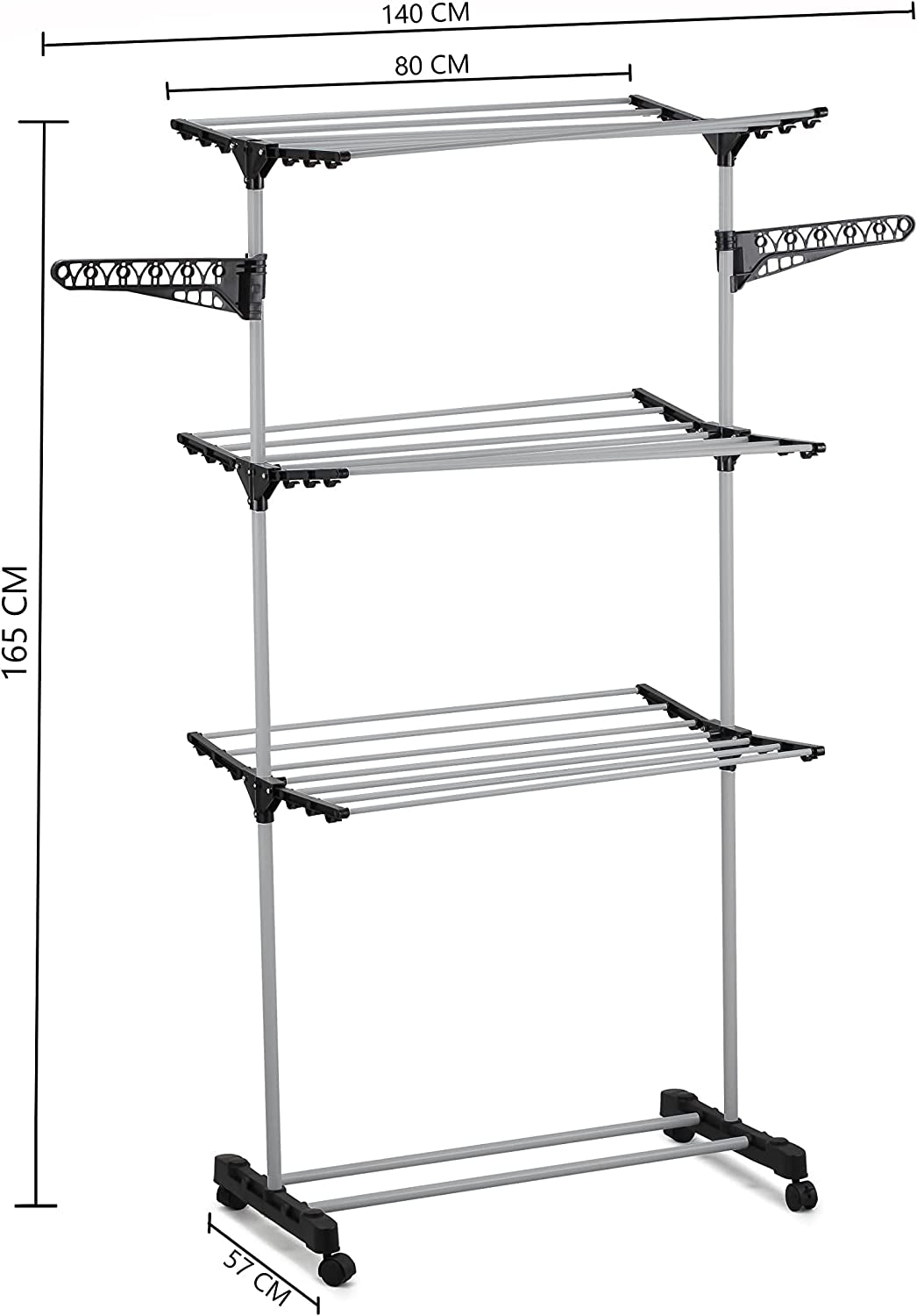 : This 3-Tier Folding Clothes Drying Rack features an overall dimension of 165 x 140 x 57 cm and a 3-tier construction with 6 foldable shelves, 2 side wings with 7 holes for hanging and drying different clothes easily and conveniently.