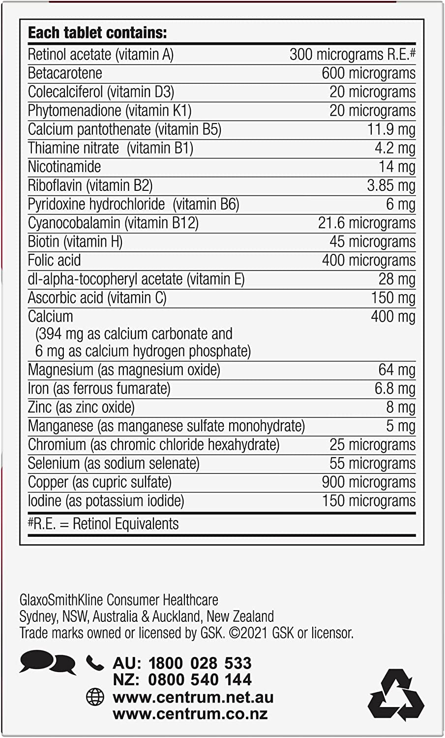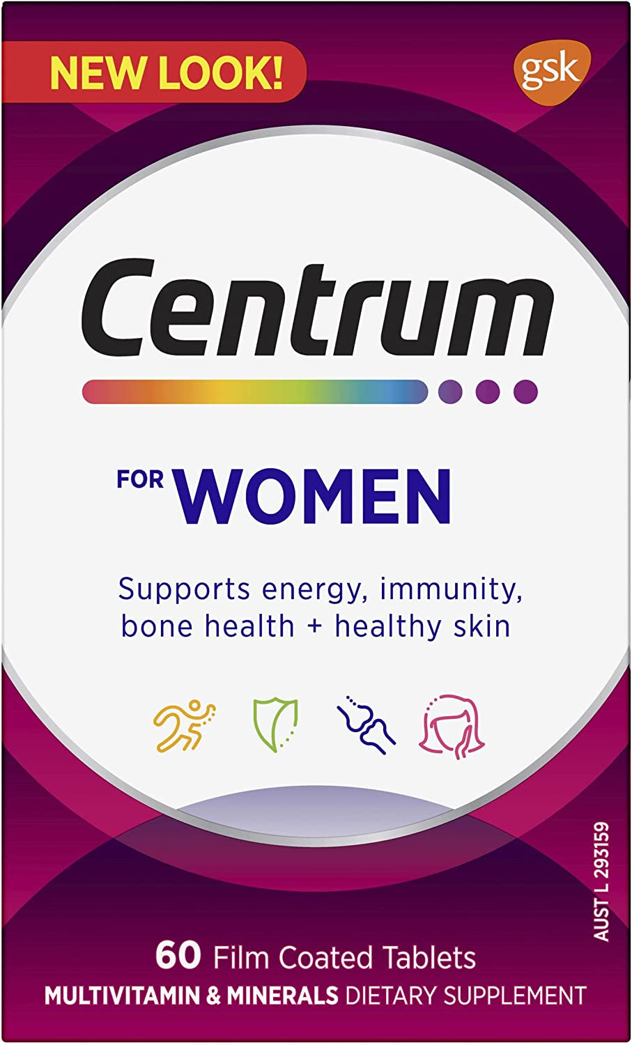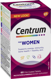 Centrum is the world's No 1 selling multivitamin and multimineral supplement range. Centrum Multivitamin And Multimineral Supplement Tablets for Women's Contains key nutrients to support the specific needs of Women including Iron and Folic Acid. Includes B vitamins and Iron to help support daily energy metabolism. Centrum Women is a complete daily multivitamin formulated with specially balanced nutrient combinations to help support health and wellbeing. Contains vitamin C which is important for the normal function of the immune system, calcium, magnesium and vitamin D which contribute to normal muscle function and includes B vitamins and Iron to help support daily energy metabolism. Contains key nutrients to support the specific needs of Women including Iron and Folic Acid. Suitable for adult Women. Take one tablet daily with a glass of water, preferably with food.