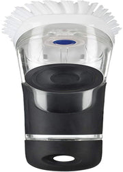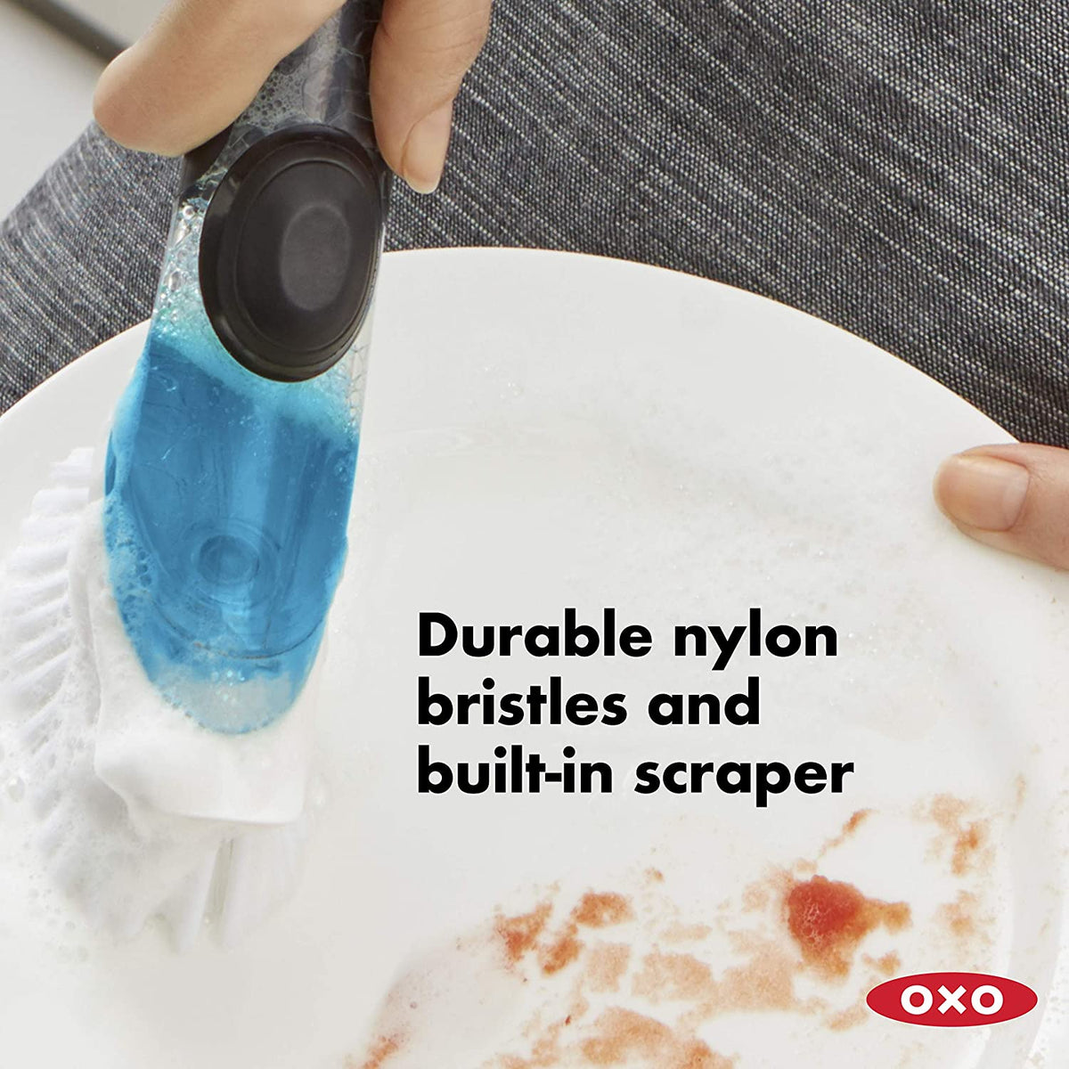 With a light push of the soft, non-slip button, the silicone valve shoots soap onto your dishes, then quickly seals to prevent drips and waste. Includes a scraper on back to remove baked-on food. Durable nylon bristles are safe for non-stick cookware and bakeware.