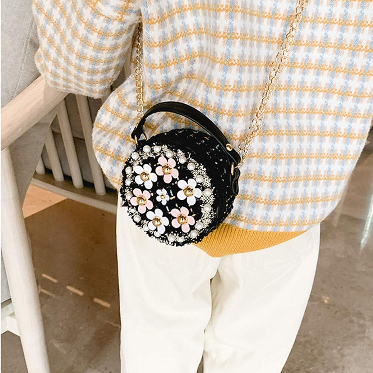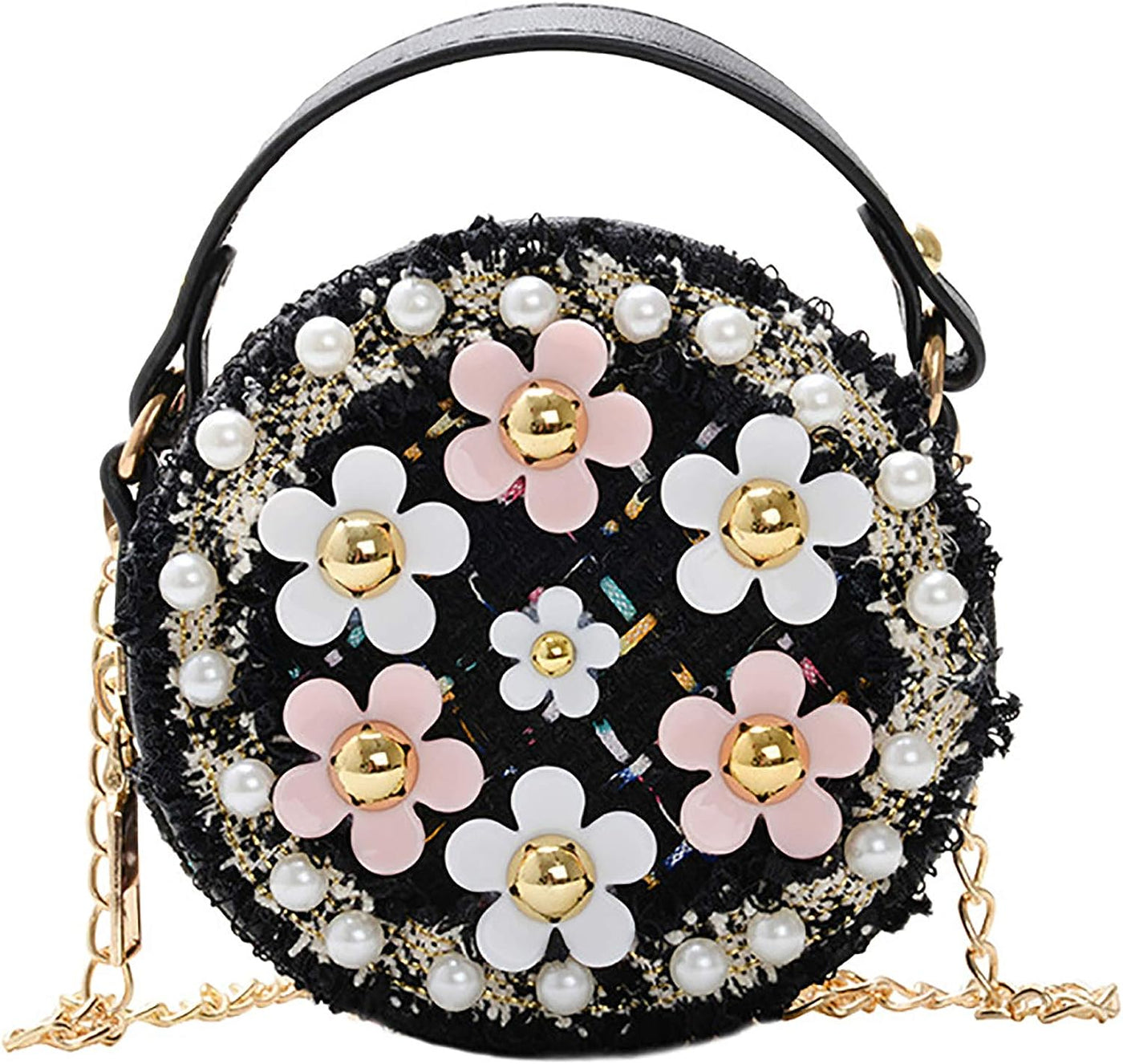 Little Girls Crossbody Purse with Pearl Flowers Mini Cute Princess Handbags Shoulder Bag for Girls Toddler Kids - A-Black