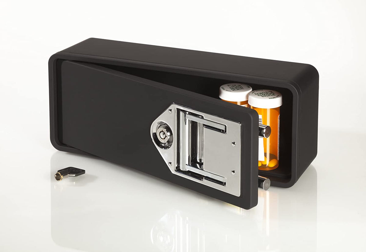 The Medicine Safe is an attractive, ergonomically designed safe with steel reinforced composite body construction engineered to keep prescriptions and over the counter medications organized and secure. Accommodating prescription bottles of up to 3.875” tall, the Medicine Safe keeps medicine secure with its patent pending locking mechanism that deploys two steel "double throw” locking bolts. The Medicine Safe rests perfectly inside a standard medicine cabinet or can be securely mounted by using any combination of 6 prepositioned mounting points.