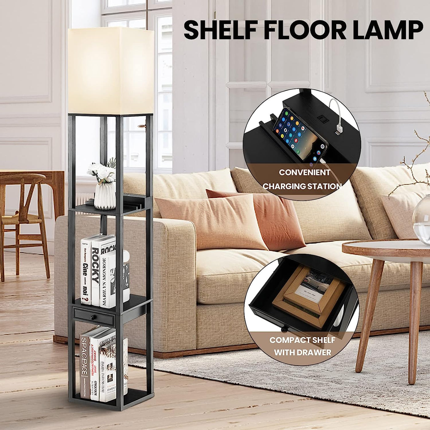 Sufficient Storage Space: With 3-tier open shelves and a drawer on the second layer, the floor lamp provides sufficient space for you to store and display different items like phone, photo frame, book and decoration. The drawer is designed with a solid handle, which makes it easy to open and close.