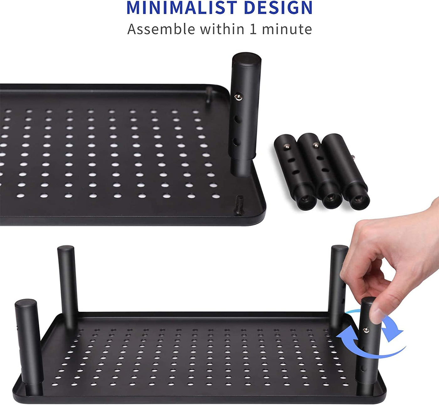 Creates more storage space to organize things like stapler, books, calculators, files, headphones. You can even use the space to stash your keyboard and mouse when not in use.