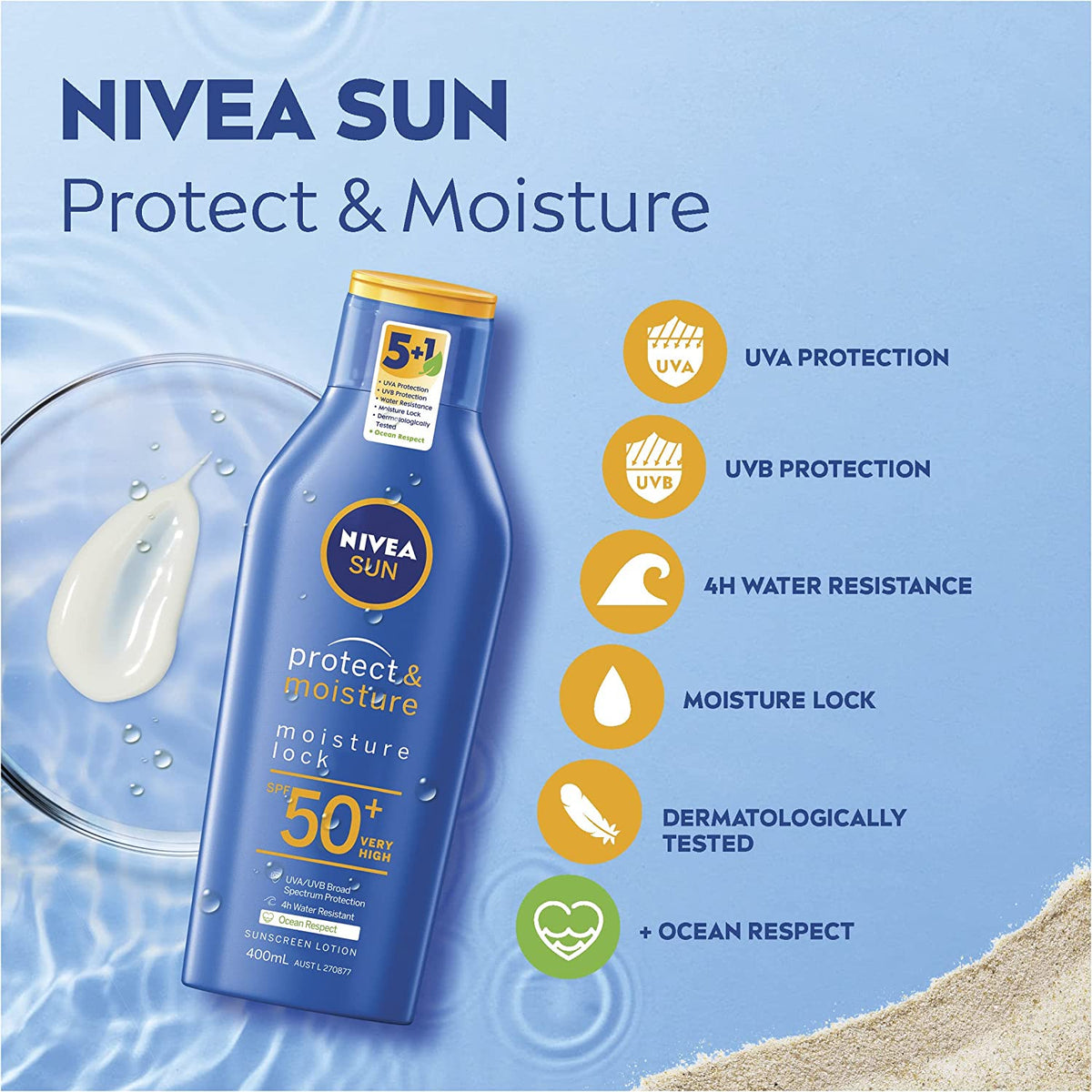 NIVEA SUN Protect and Moisture Moisture Lock SPF50+ Sunscreen Lotion cares for you and the oceans in more ways than one with 5+1 protection. With broad spectrum protection and a moisturising formula, this sunscreen protects you from harmful UV rays whilst nourishing your skin with Panthenol and Vitamin E. You can expect UVA and UVB protection against skin ageing and sunburn, plus 4 hour water resistance. Dermatologically tested. Made in Australia.