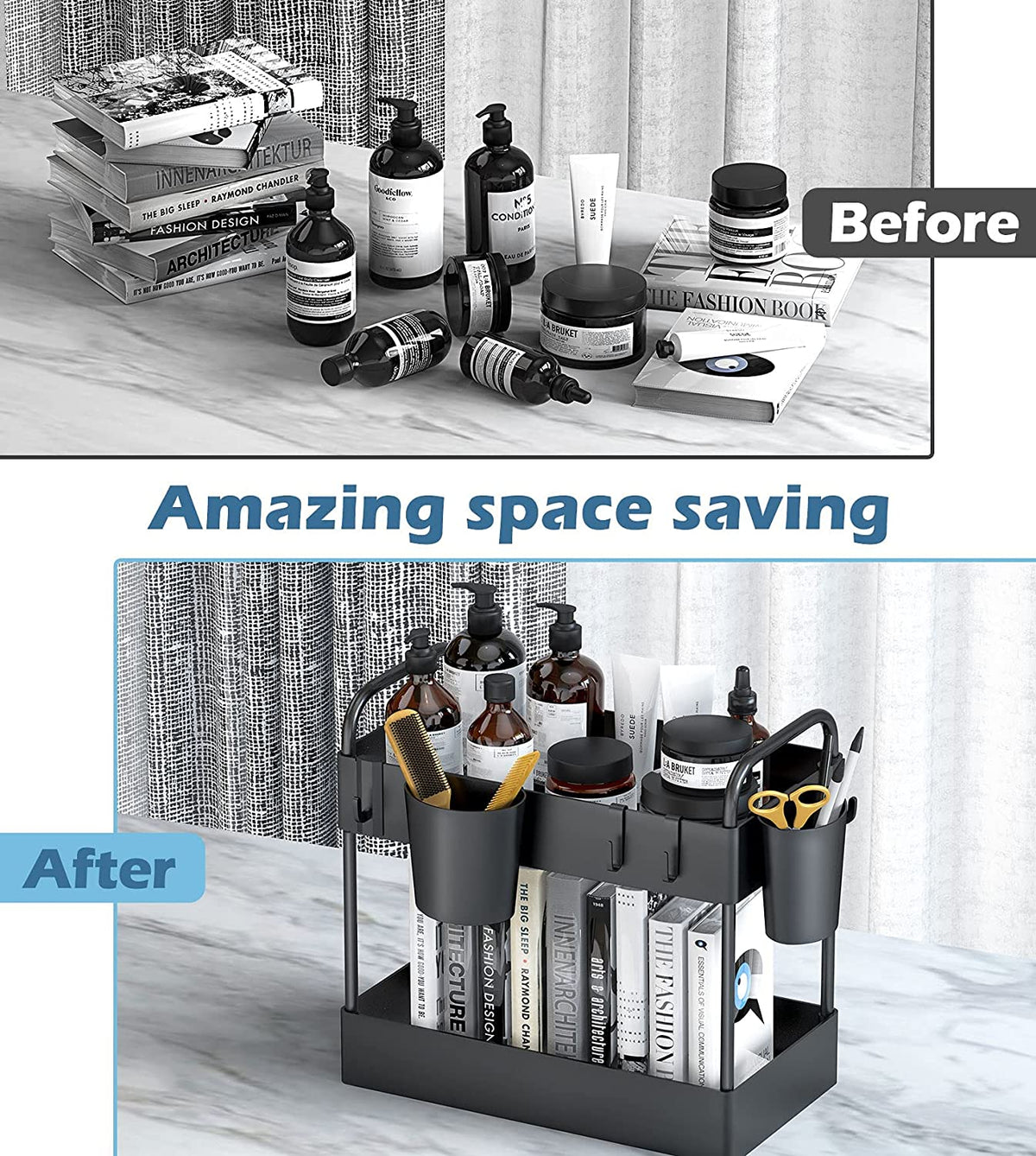 Sleek HandleEasy to carry it when you want to change its position | HooksWith 4 hooks to increase more space for you. | Spacious StorageWith 2 removable hanging cups to provide more sufficient space to optimize the space utilization as much as possible. Don't worry that there is no room for spoons, forks or toothbrushes. |
