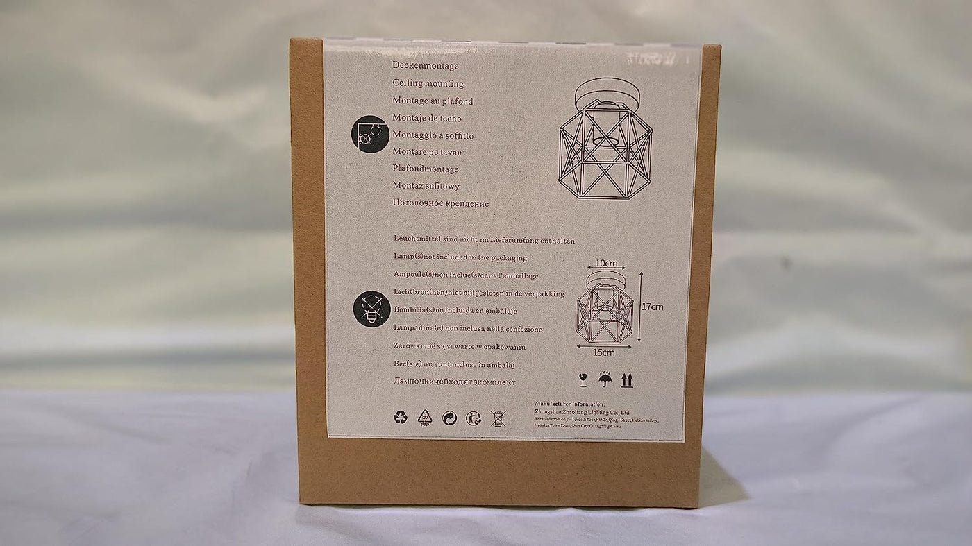 The open style geometric shape is in minimalism style and classic fashion design, which is concise but not simple. The special design must let your room decoration make difference from others. The iron hollow design is not only for attractive appearance but also can bring your wonderful light transmission effect. Specifications: Type: Industrial Ceiling Lamp Quantity: 1PC Material: Iron Color: Black Irradiation area: 5 ~ 10㎡ Voltage: 220V- 240V Lamp holder: 1× E27 screw port (NOT included bulb) Size: 17×15×10cm/ 6.7× 5.9× 3.9inch Net Weight: 390.0g Package Included: 1 x Ceiling Light(bulb not include)