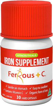 Vitaceuticals Ferrous + C Iron Supplement is an iron supplement for those low in Iron, and contains additional Vitamin C for assisting uptake of Iron. Gentle on Stomach. Easy to Swallow. Contains Vitamin C to assist with uptake of Iron. Organic form of iron leading to greater absorption of iron compared to other salt forms. The Gluconate form of iron is gentle on the stomach, causing less GI upset and less constipation. Direction: Take 1 capsule daily or as professionally prescribed. Contains: 30 Capsules.